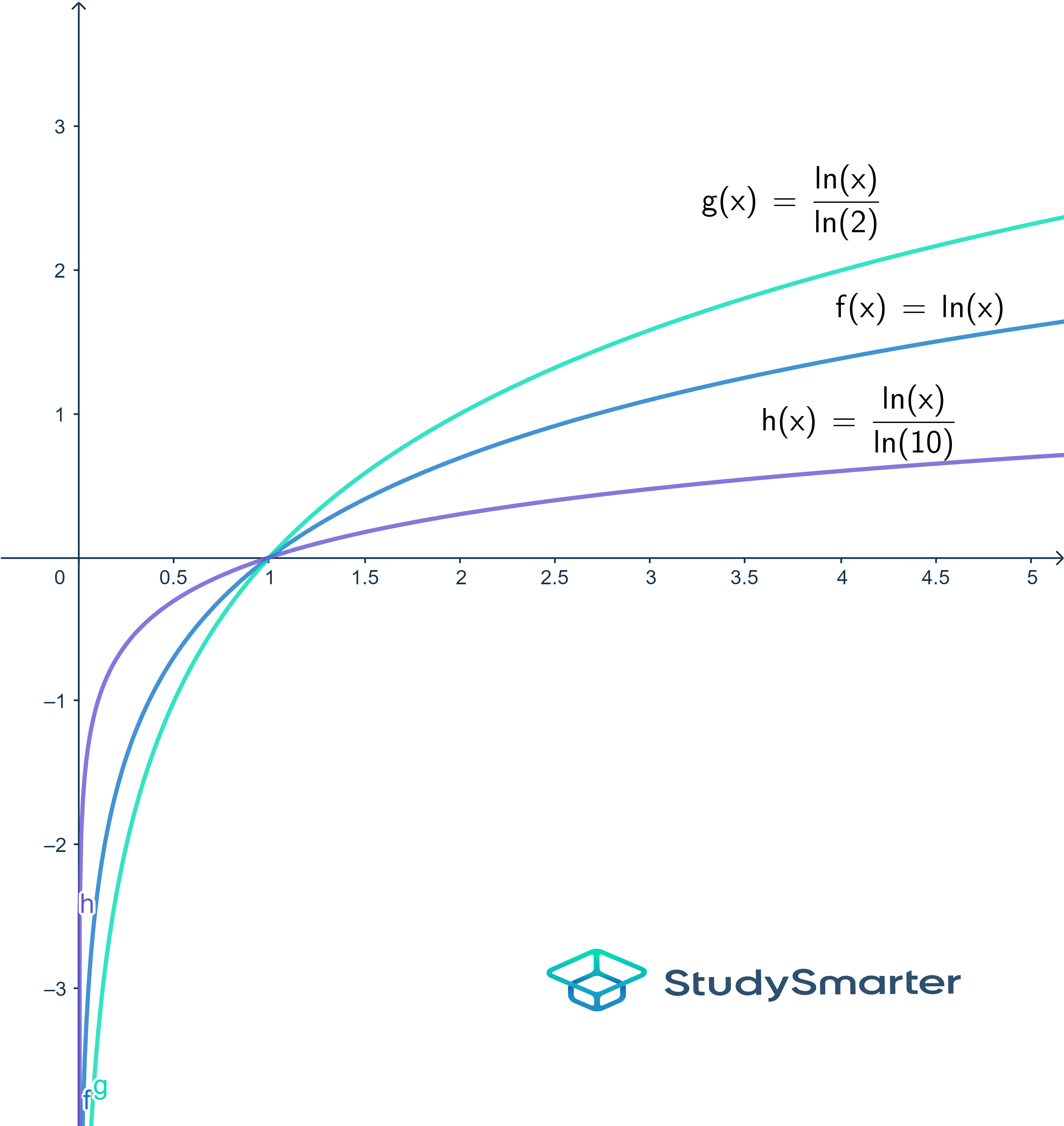 Comparaison du logarithme naturel, du logarithme de base 2 et du logarithme de base 10 | StudySmarter Originals