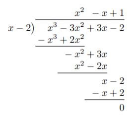 Par FTA, nous observons que f(x) a un degré de n = 3, et que nous devons donc avoir 3 solutions. En utilisant la division longue, nous pouvons factoriser f(x) comme suit .