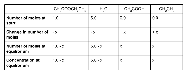 Nous avons commencé avec 1 mole d'éthanoate d'éthyle. Si x moles de celui-ci réagissent, notre mélange d'équilibre contiendra 1 - x moles d'éthanoate d'éthyle. De même, nous avons commencé avec 5 moles d'eau. Comme le rapport molaire est de 1:1:1:1, x moles d'eau réagiront également, et le nombre de moles d'eau à l'équilibre sera donc de 5 - x.