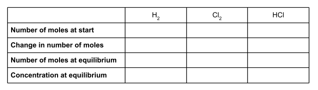 Remarque que dans l'équation, le rapport molaire entreH2:Cl2:HCl est de 1:1:2. Dans Kc, nous devons donc augmenter la concentration de HCl à la puissance 2.