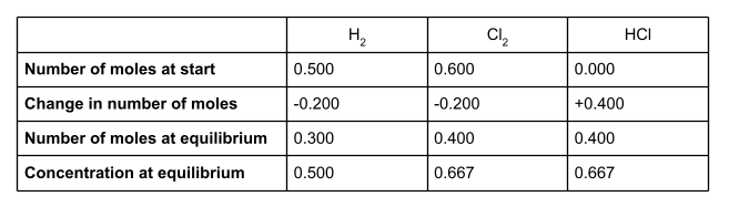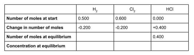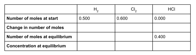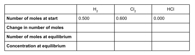 Dans un récipient hermétique d'un volume de 600 cm3, 0,500 molH2 et 0,600 mol Cl2 réagissent pour former un équilibre avec l'équation suivante :