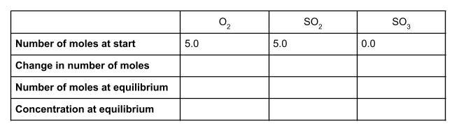 5,0 moles d'O2 et 5,0 moles de SO2 atteignent un équilibre dynamique dans un récipient d'un volume de 12 dm3. L'équilibre contient 3,0 moles de SO3. Trouve Kc et donne son unité. L'équation suivante peut t'aider :