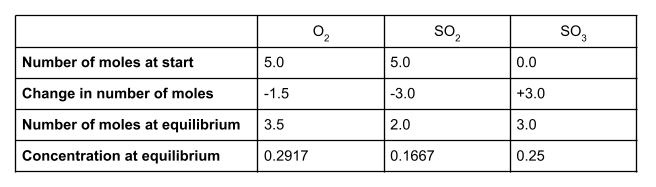 À l'équilibre, nous avons 3 moles de SO3. Le changement de moles est donc de +3. Comme notre rapport molaire est de 1:2:2, le changement de moles pour O2 doit être de -0,15 et le changement de moles pour SO2 doit être de -0,3. Nous pouvons maintenant calculer le nombre de moles de chaque espèce à l'équilibre et leurs concentrations, en utilisant le volume donné de 12 dm3: